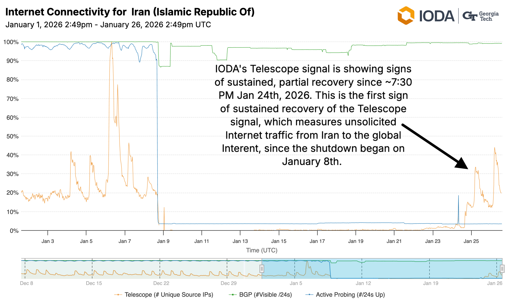 On January 24th, 2026, IODA began seeing initial signs of Iran's return to connectivity to the global Internet via the Telescope signal. A sustained increase in the telescope signal indicates that Iranian devices are connected to the global Internet because they are producing unsolicited Internet traffic captured by the Telescope.