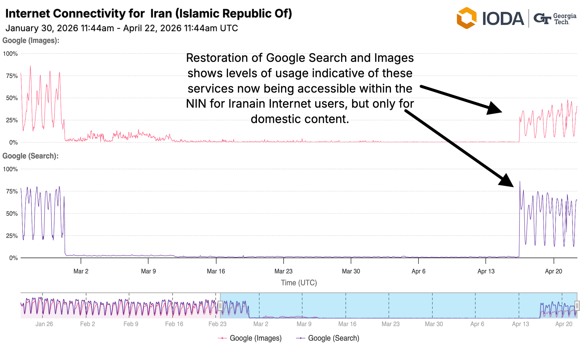 - The Iranian Regime has restored domestic, NIN access to specific online content like Google Search and Google Images. This means these services are available to the general Iranian-based Internet user, but still restricted to domestically available content on the NIN.