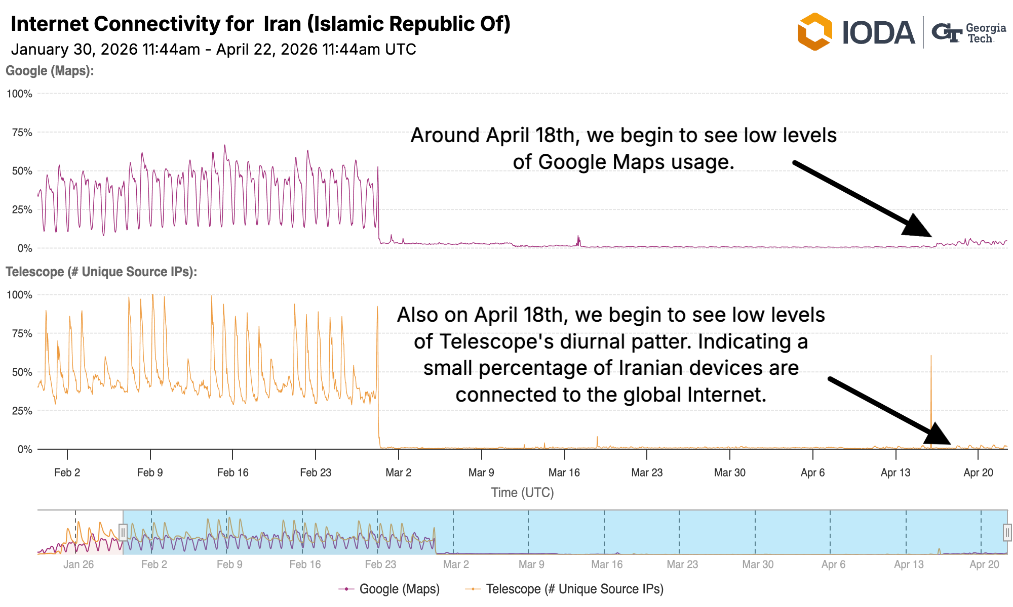 - There is evidence of the "Internet Pro" in the Google Product data that we know to still be whitelisted but show slight signs of recovery, namely: Google Maps. Additionally, IODA's telescope signal shows a slight increase in Internet pollution emanating from Iran, with it's usual diurnal pattern. Looking at the network level, we see a small increase in Telescope traffic on IranCell (AS44244) which is a mobile operator in Iran participating in the Internet Pro access. What is visible in IODA has been verified through traffic data from David Belson at Cloudflare Radar and Doug Madory at Kentik.