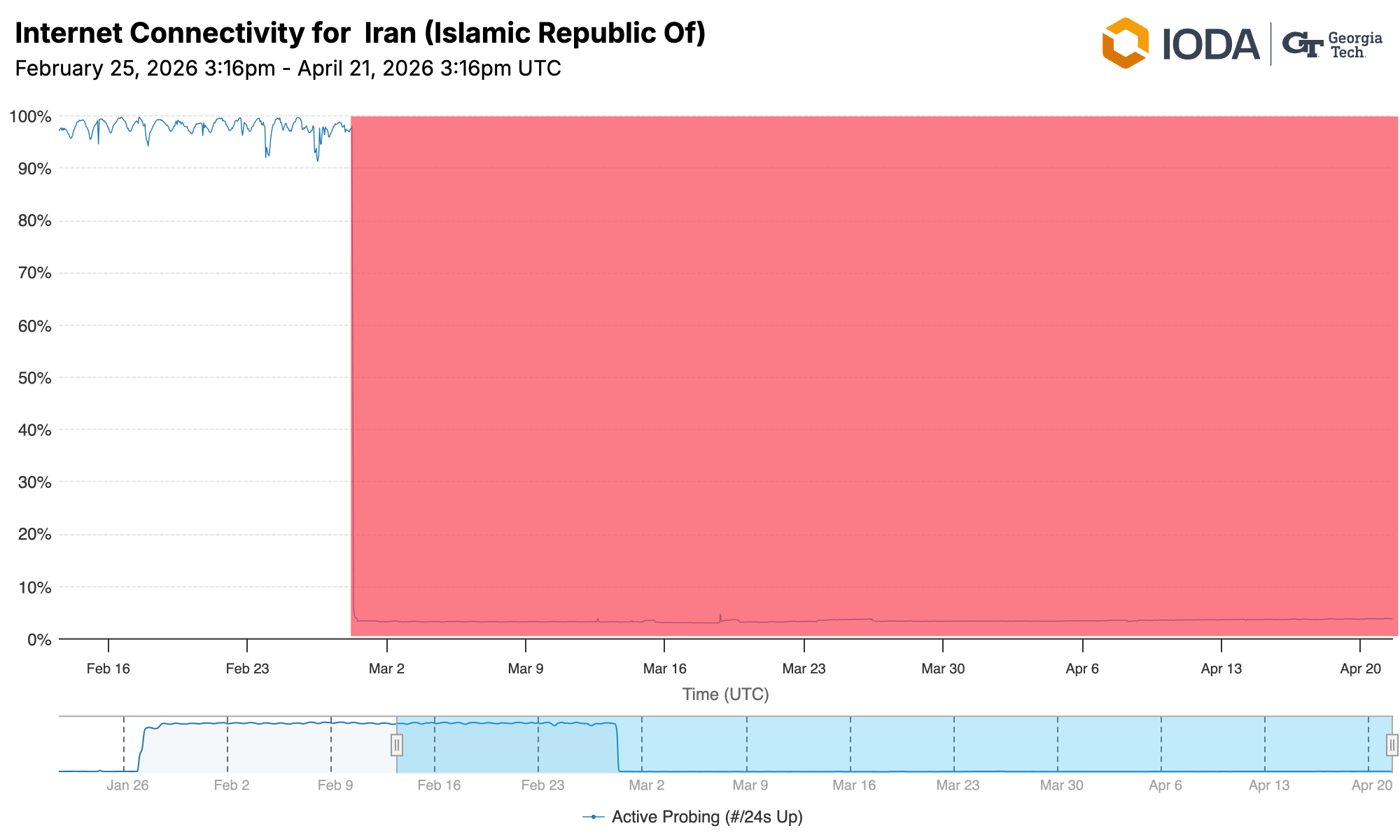 - Access to the global Internet is still largely shutdown, as visible in IODA's Active Probing signal