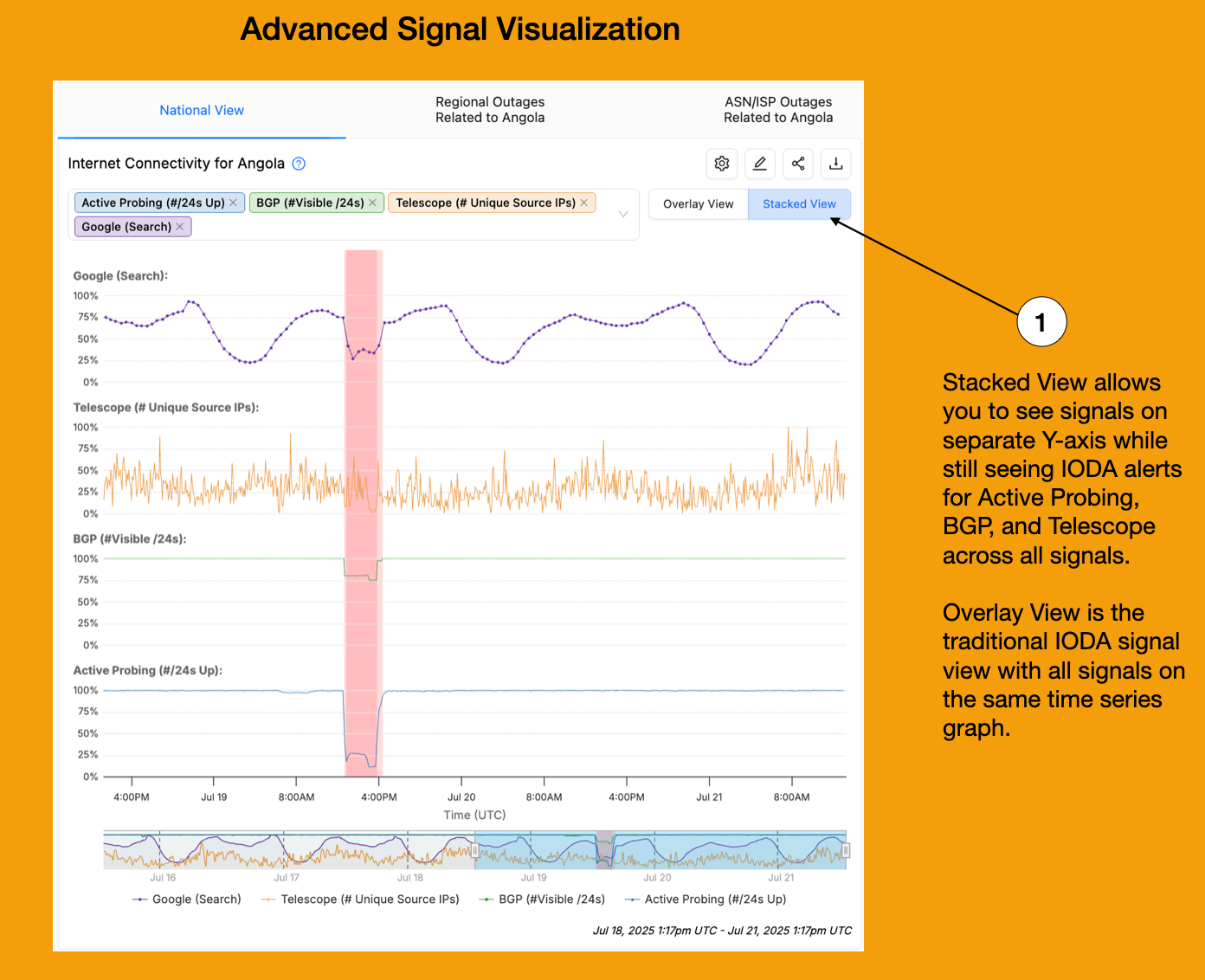 - Stacked Signal View: Users can toggle a stacked view for all connectivity signals. Each signal (e.g., BGP, Active Probing, Telescope) sits on its own y-axis, but all share a common time (x-axis) and alert bands. This setup makes it easy to correlate disruptions across different layers of the internet measurements while avoiding confusion from overlapping or scale differences. This also supports the IODA team’s future plans of integrating additional signals, which could crowd a single time series graph.