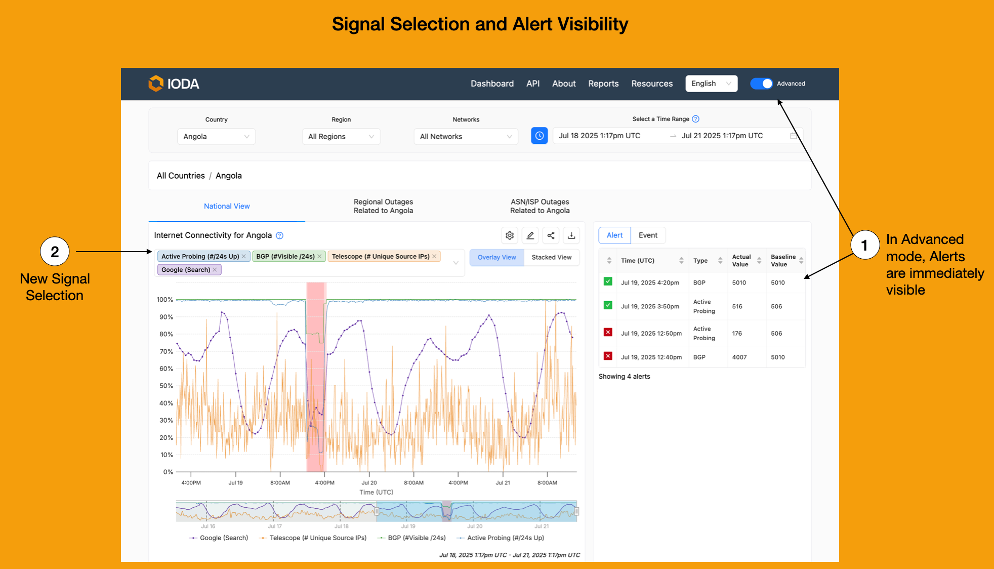 The IODA dashboard overhaul delivers both broader context and finer detail. From a high-level global view to granular detail at the AS level, the dashboard now surfaces vital information more efficiently and intuitively for users. Among the key benefits: