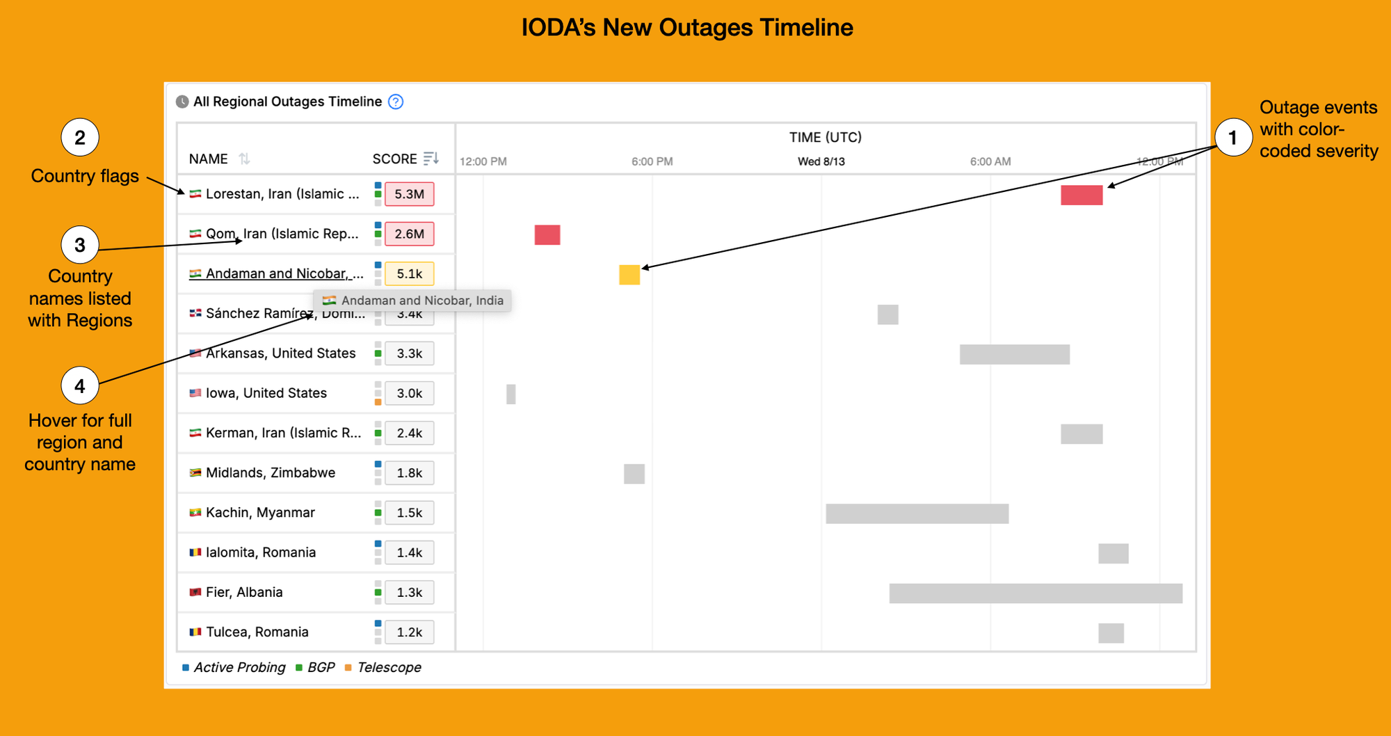 Understanding the scope and impact of outages just got easier. The new Outages Timeline View displays outage events across time at the country, region, and ASN/ISP levels. Events are now color-coded by severity, enabling us to quickly identify significant issues and trends at a glance. This new view aims to improves the speed and accuracy of Internet outage discovery over time, making it ideal for both rapid response and in-depth analysis.