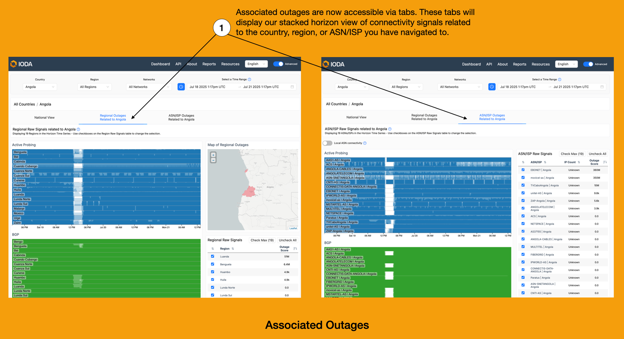 - Tabbed Associated Outages: A major usability upgrade, related outages for related regions, countries, or ASNs/ISPs are now immediately discoverable through tabs. This stacked horizon view consolidates previously hard-to-find data, empowering users to see associated disruptions and broader impacts with just a click.